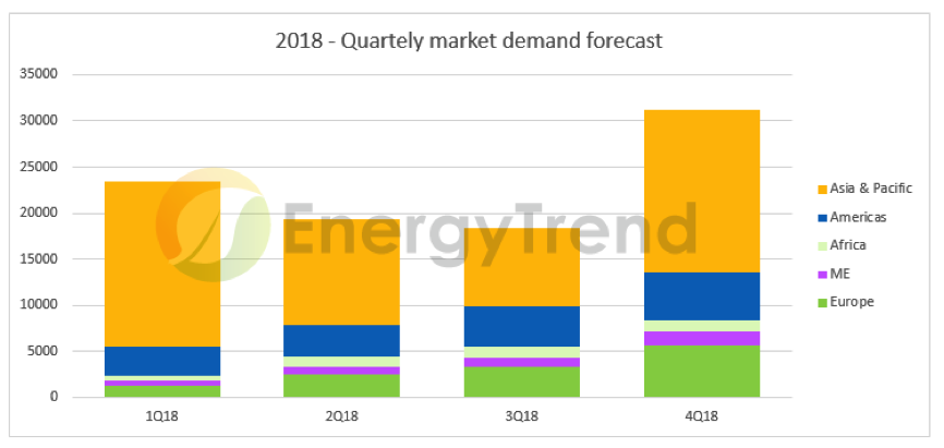 China will remain the world's largest PV market despite the decreasing demand. However, due to the tightening policies in 2018, the global PV demand is expected to set back in 2018. According to the gold member report of EnergyTrend in 2Q18, the global PV demand will decline to 92~95GW due to the shrinking of the Chinese market, and will not return to above 100GW until 2019 when more new markets emerge.